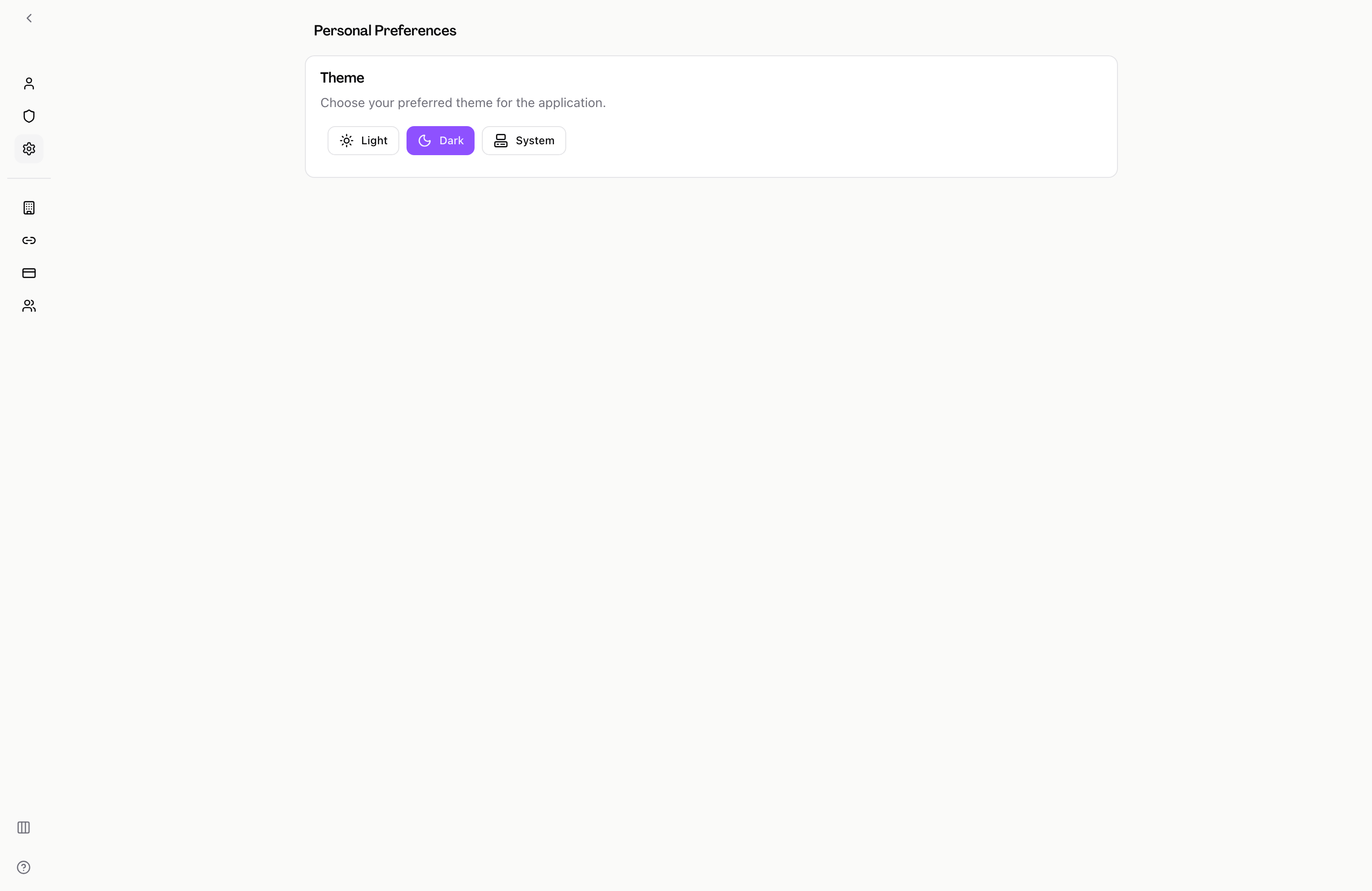 Choose a theme — The Theme section presents three options: Light, Dark, and System. Click the button for the theme you want to use. The change applies immediately — there is no save button.