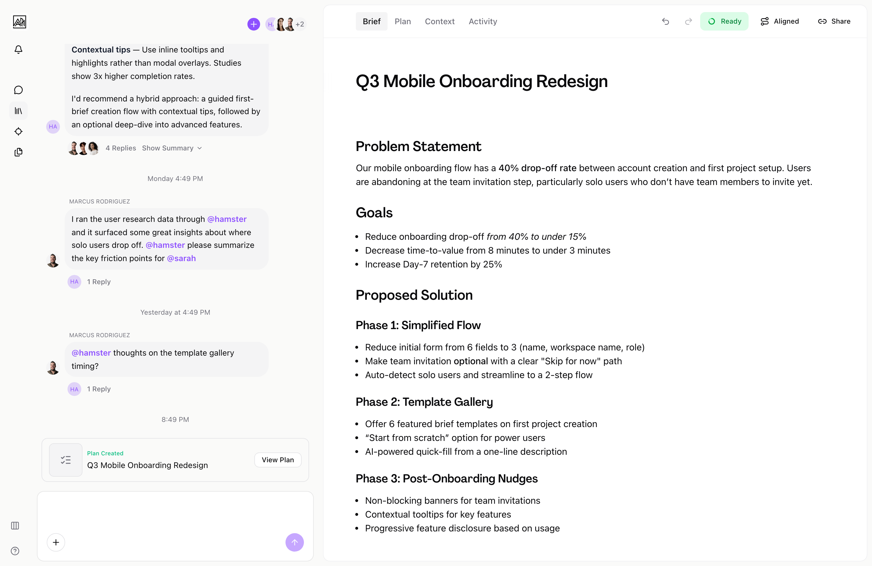 Invite teammates into a brief so they can read, contribute, and vote on readiness alongside you.