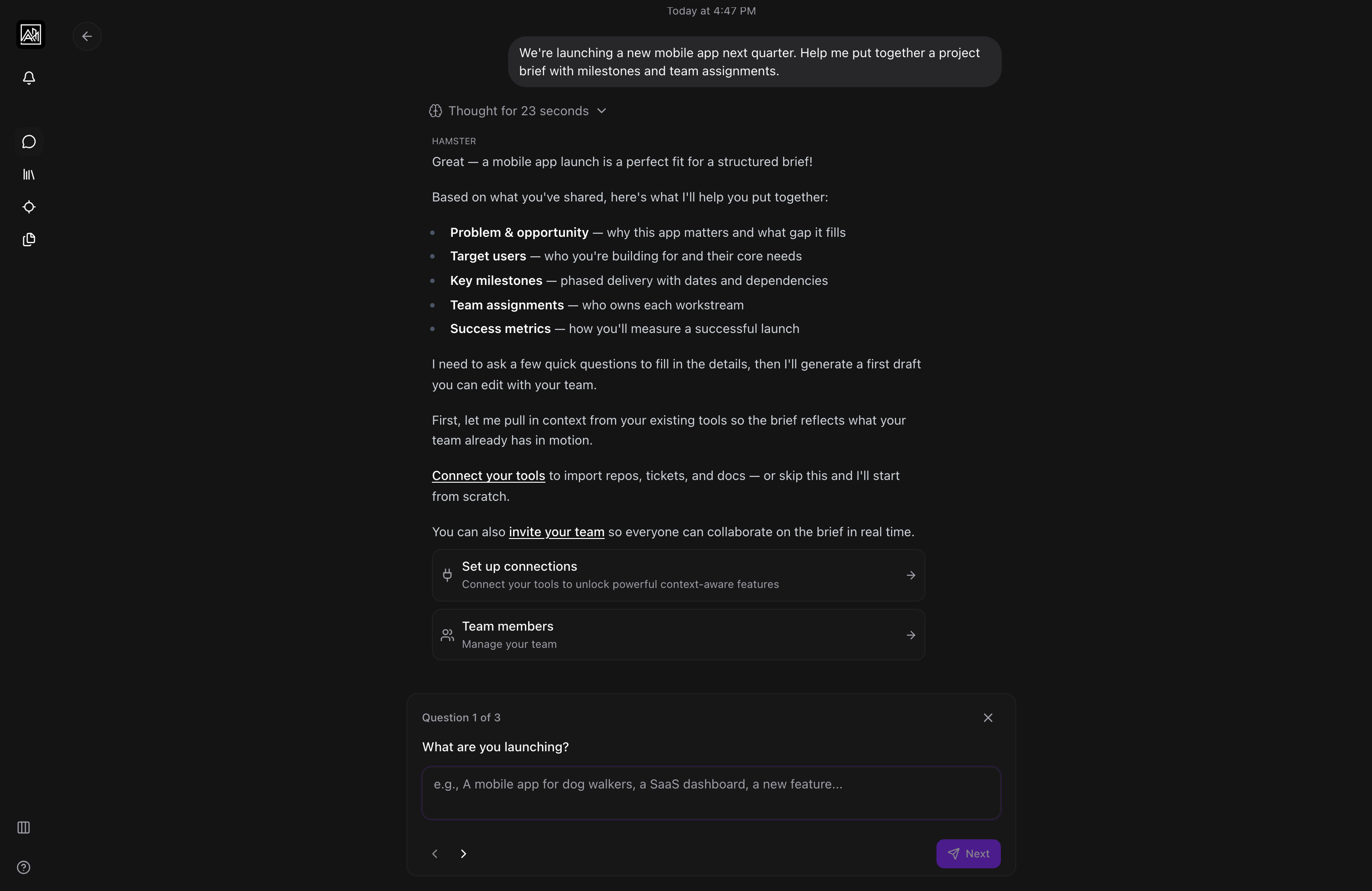 A brief is a structured document for a project, feature, or initiative. You can create one directly from a conversation.